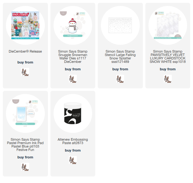 I die cut the snowman from some Simon Velvet cardstock...I wanted the snowman to have a fluffy look...like he is really made of snow! I die cut his arms, scarf, and hat and layered them. I adhered them to a panel that I had brushed very light blue ink onto...a pastel blue, then used a very large stencil of snow with embossing paste. The sentiment was from a set that had been recently discontinued(Snowflake Circles)...so sorry. Here's a close up...